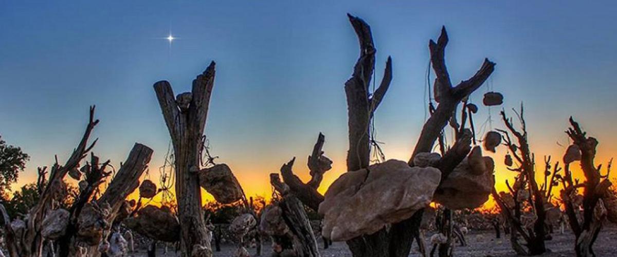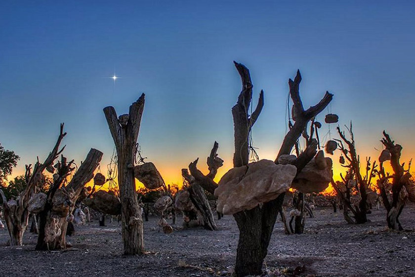 در گوشه ای از شهر سیرجان باغی در زمینی خشک به چشم می خورد که درویش خان اسفندیارپور آن را بنا کرده است؛ باغی که ذره ای حیات در آن دیده نمی شود و سال هاست که همه چیز در آنجا مُرده است. آنچه پیش روی مان قرار دارد، یک باغ به شکل یک شش ضلعی نامنظم است که به جای سرسبزی تنها درختان خشکیده ای را در خود جای داده و میوه هایش از جنس سنگ هستند. در دانه دانه این میوه های سنگی رازی نهفته است و هر کدام شان علامت سوالی را به دنبال خود می کشانند.