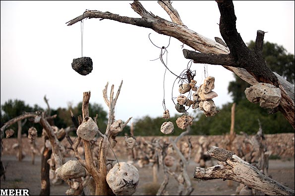 درویش خان به سنگ اکتفا نکرد و مدتی هم به آویزان کردن سر گوسفندانی که توسط گرگ دریده شده بود پرداخت تا اینکه با اعتراض مردم، دست از کارش برداشت. لوله اگزوز ماشین، چرخ دنده های فرسوده، لاستیک های نخ نمای پنچر شده، پیت نفت، قوطی حلبی، انبارک نفت چراغ علاءالدین، آینه شکسته و شناور کولر، فنر، مقره های شکسته، تیرهای تلگراف، نی قلیان شکسته و بسیاری ضایعات دیگر هم بر این درختان پدیدار شدند. او از هر چیزی برای آویختن سنگ هایش استفاده می کرد؛ از زنجیر موتور گرفته تا سیم هایی که حاصل از آتش زدن لاستیک ها بوده اند، همه و همه هنوز هم بر درختان قابل مشاهده هستند.