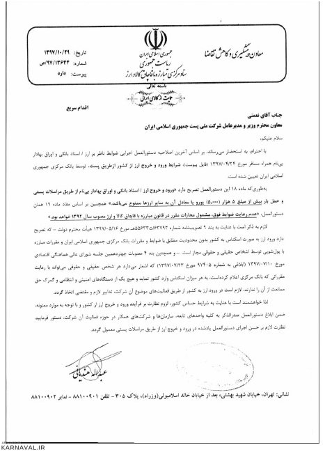 پیرو بخشنامه هایی در خصوص شرایط ورود ارز به کشور مطابق با بند (۴) مصوبات جلسه شورای عالی هماهنگی اقتصادی کشور مورخ ۹۷.۰۷.۱۰، هر شخص حقیقی و حقوقی می تواند با رعایت مقرراتی که بانک مرکزیاعلام کرده به هر میزان اسکناس ارز وارد کشور نماید و هیچ یک از دستگاه های امنیتی، انتظامی و گمرک حق ممانعت از آن را ندارد، هرگونه ممانعت تخلف اداری محسوب می شود و فرد متخلف در صورت محکومیت در بار اول به انفصال موقت به مدت ۶ ماه و در صورت تکرار به مجازات های بالاتر محکوم می شود.